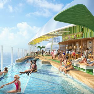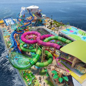• Largest water park at sea with six slides and seven pools, including the eight-story Hideaway Pool.
